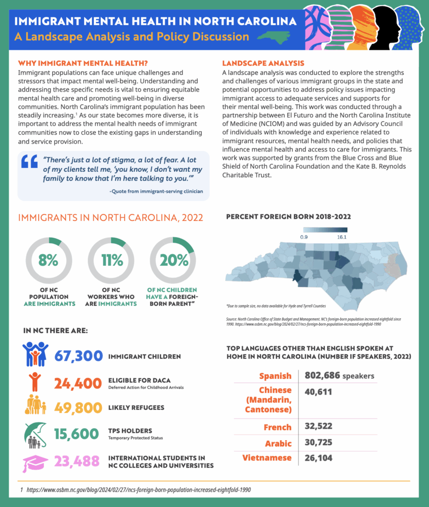 This analysis was carried out through a partnership between El Futuro and the North Carolina Institute of Medicine (NCIOM) and was guided by an Advisory Council of individuals with expertise in immigrant services, mental health, and policies influencing access to care. The work was supported by grants from the Blue Cross Blue Shield of North Carolina Foundation and the Kate B. Reynolds Charitable Trust.
