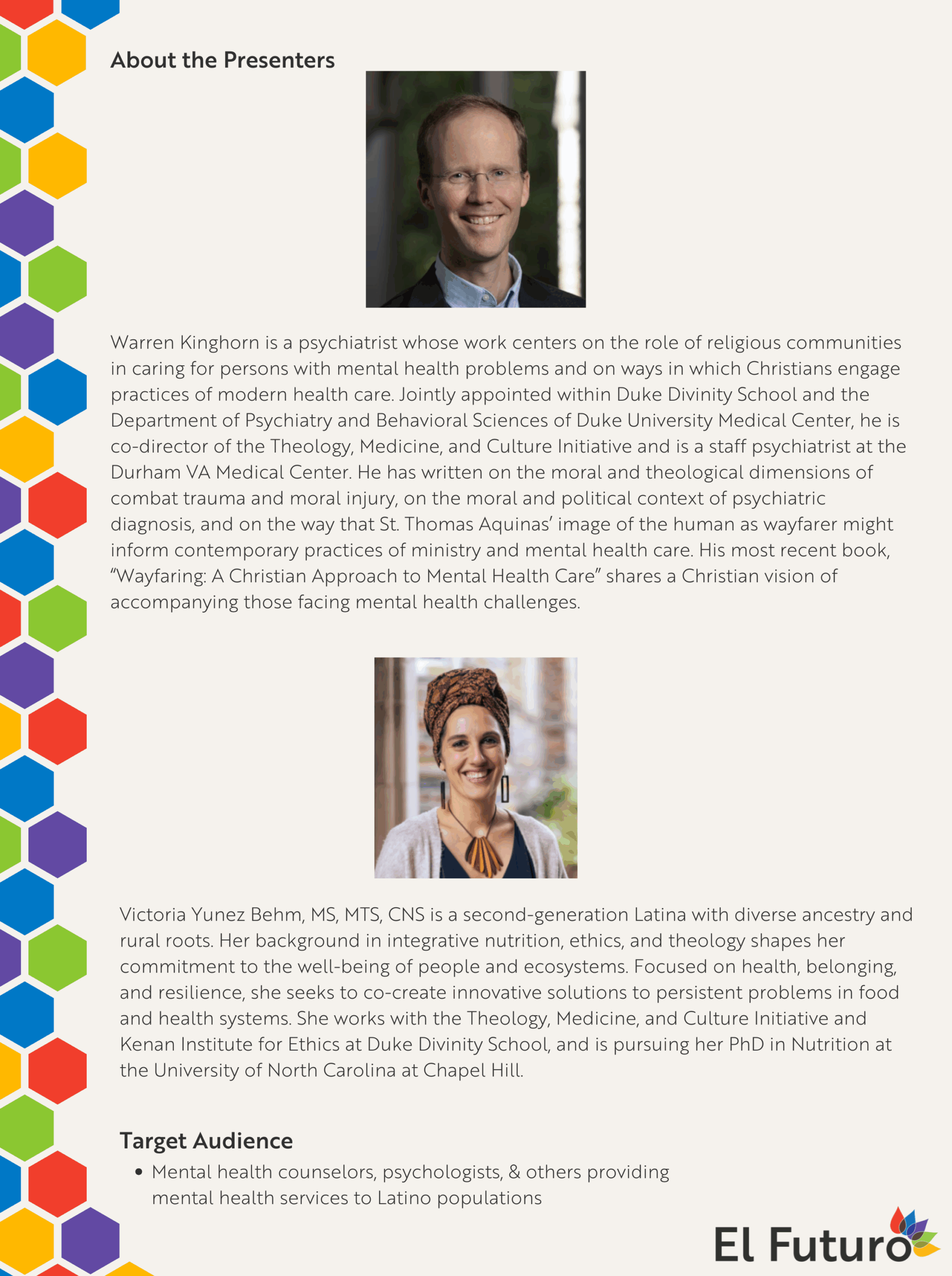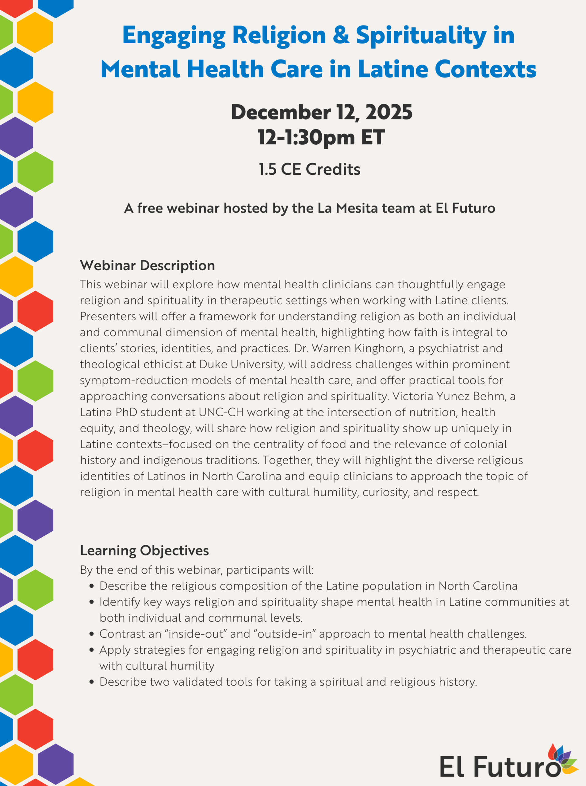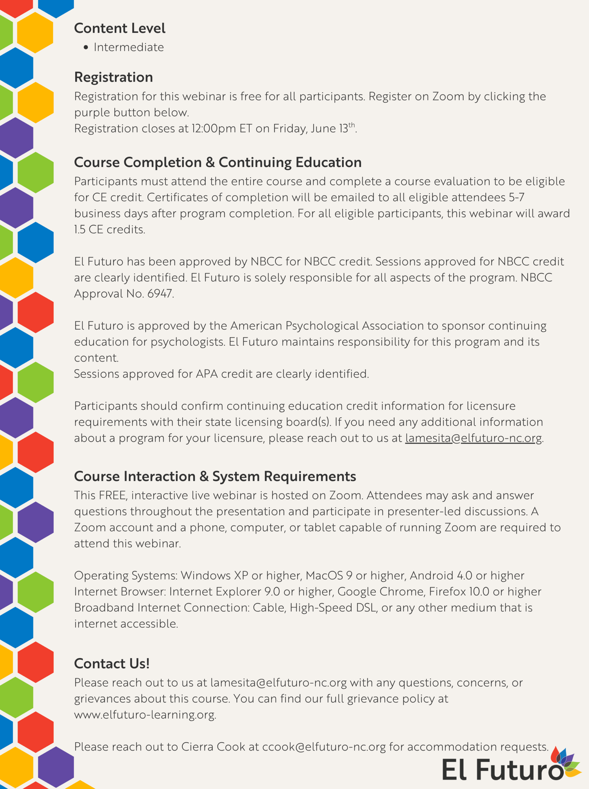 Participants should confirm continuing education credit information for licensure requirements with their state licensing board(s). If you need any additional information about a program for your licensure, please reach out to us at lamesita@elfuturo-nc.org.
